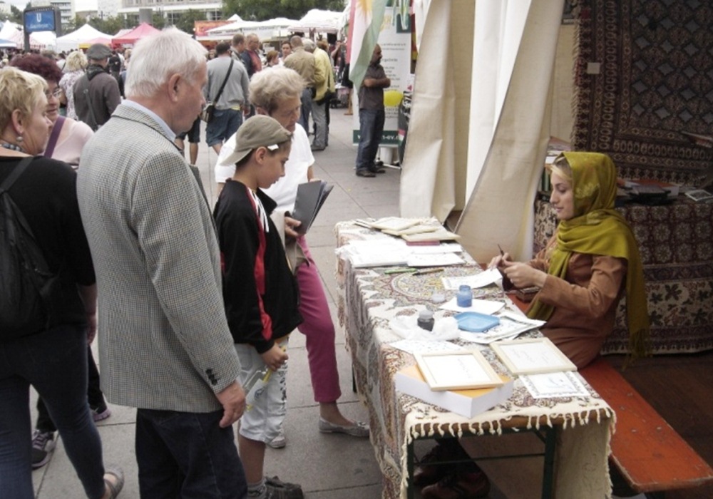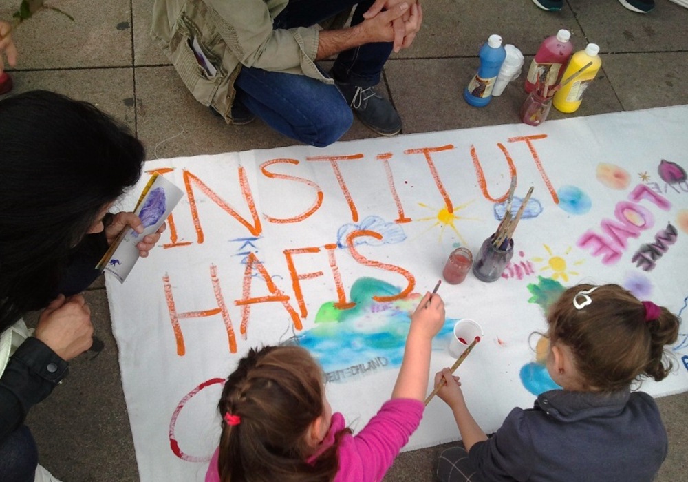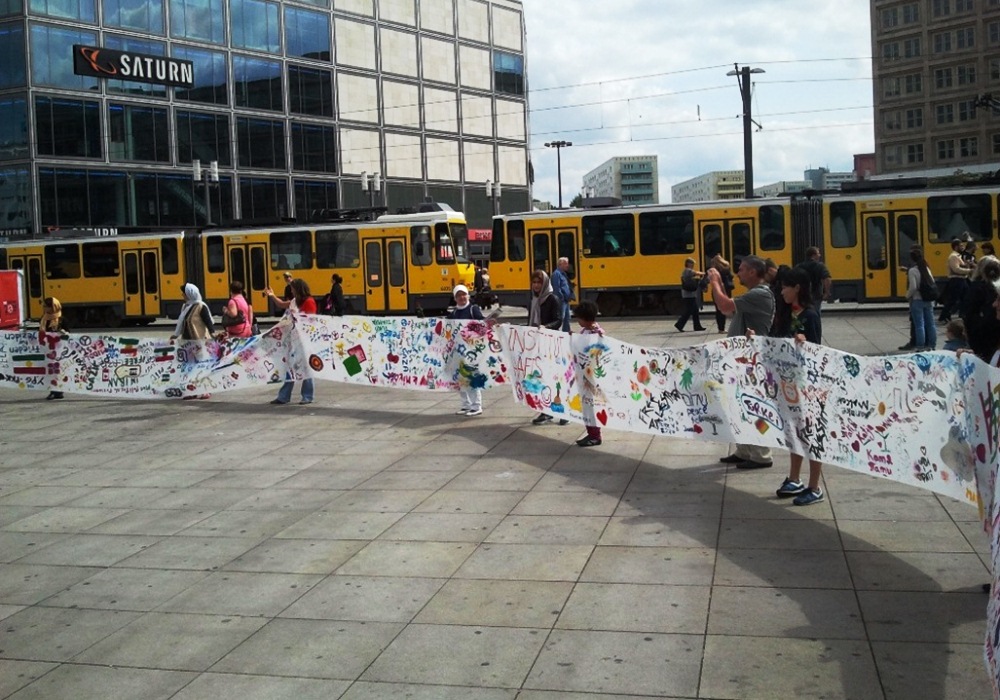 Auch in diesem Jahr nahm das Hafis Institut am Friedensfestival Berlin (14.-17. august 2014, Alexander Platz) mit einem Iran-Stand teil. Als besonderen Beitrag für ein friedliches Miteinander haben wir in diesem Jahr ein 25 Meter langes Stoffplane mitgenommen und die Kinder durften ihre Friedensbilder zeichnen oder ihre eigenen Sprüche schreiben.