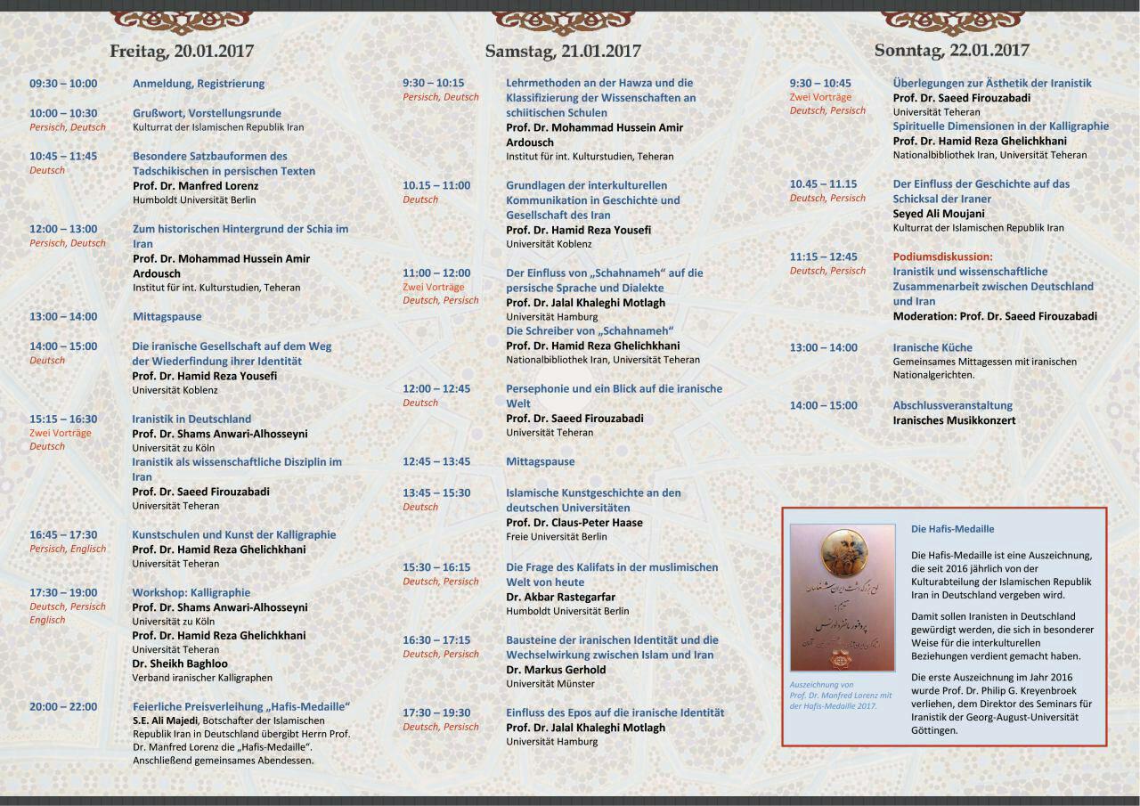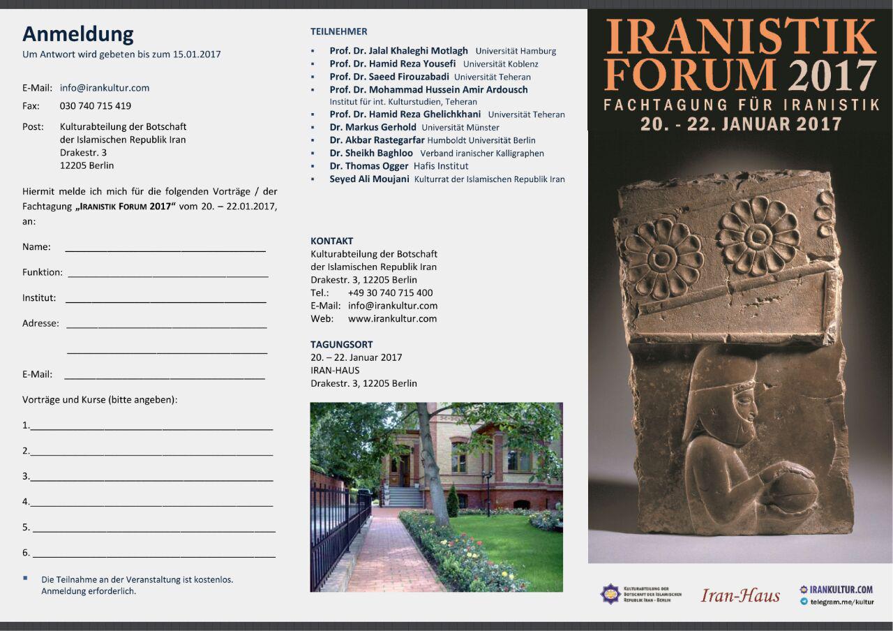 Vom 20. – 22. Januar 2017 lädt der iranischen Kulturrat zur ersten Fachtagung für Studenten, Dozenten und Professoren der persischen Sprache und Literatur und der Iranistik und Orientalistik in Deutschland in das Iran-Haus in Berlin, ein.
